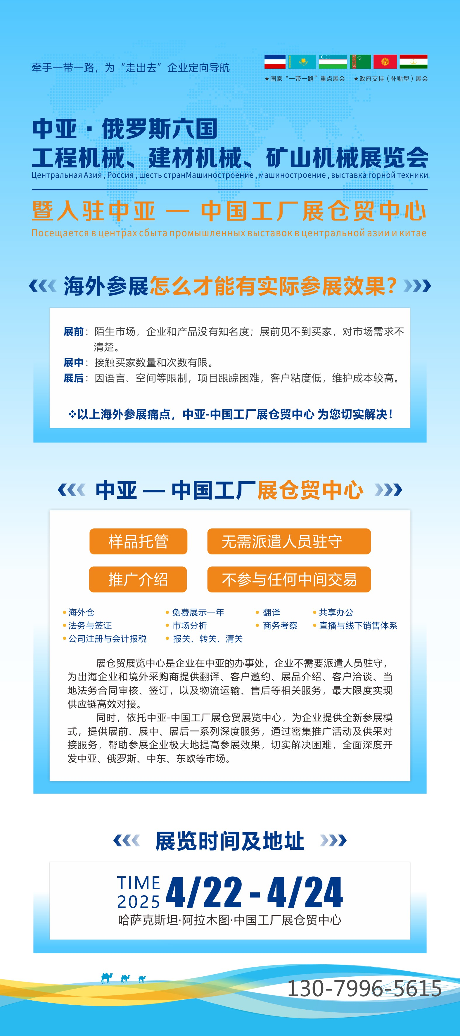 时间:集中展览:2025年4月22-24日 常态化展览:2025年4月25日-2026年4月21日 地点:哈萨克斯坦·阿拉木图·Sairan国际展览中心 主办单位:IBE商务展览有限公司 鸿蒙会展集团 支持单位:哈萨克斯坦地质和自然资源部 哈萨克斯坦工业和基础设施发展部 塔吉克斯坦共和国工业和新技术部 吉尔吉斯斯坦矿业委员会 乌兹别克斯坦建材工业协会 土库曼斯坦工业企业家协会 俄罗斯矿业协会 本次展会在“一带一路”合作倡议前景下,旨在为国内参展企业在中亚、中东欧、俄罗斯等地区矿业、工程及建筑企业搭建一个全面交流及贸易合作的务实高效平台,助力中国企业走出,开拓中亚、中东欧、俄罗斯等市场。 同期召开 中亚·俄罗斯六国煤炭工业与矿业装备展览会 中亚·俄罗斯六国砂石及尾矿与建筑固废处理技术装备展览会 中亚·俄罗斯六国市政工程建设产业展览会