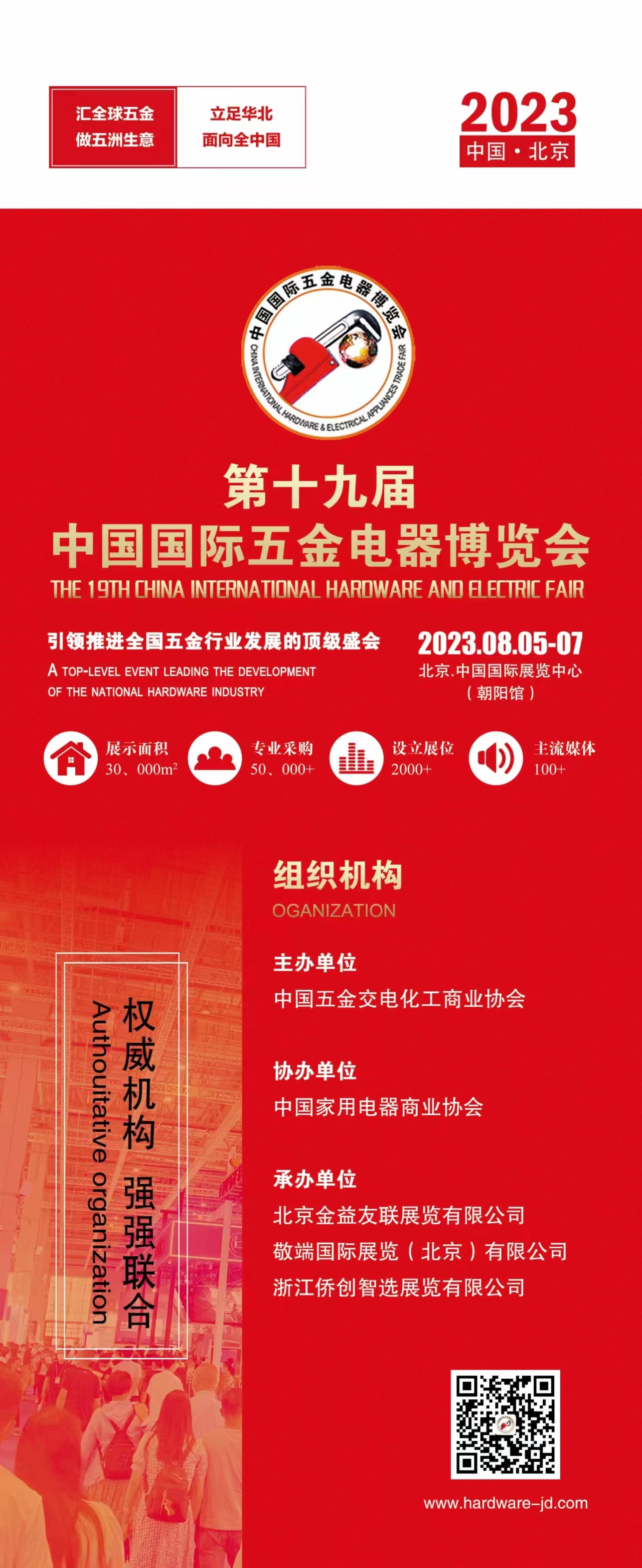 2023第十九届中国国际五金电器博览会 参展联系:刘洋18511896383 THE 19TH CHINA INTERNATIONAL HARDWARE AND ELECTRIC FAIR 2023年08月05-07日 北京.中国国际展览中心(朝阳馆) 】组织机构 【主办单位】中国五金交电化工商业协会 【协办单位】中国家用电器商业协会 【承办单位】北京金益友联展览有限公司 敬端国际展览(北京)有限公司 浙江侨创智选展览有限公司