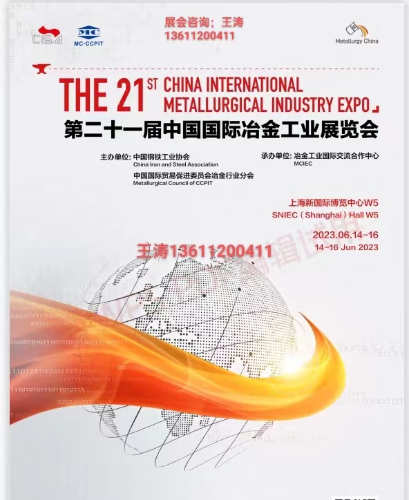 第二十一届中国国际冶金工业展览会 2023 年6 月 14-16 日 上海新国际博览中心 同期举办:第十七届中国国际耐火材料及工业陶瓷展览会 Approved by UFI ──国际展览联盟 (UFI) 认证的国际知名展览会 ──世界第二大冶金及金属热加工展览会 主办单位: 中国钢铁工业协会 中国国际贸易促进委员会冶金行业分会 冶金工业国际交流合作中心 第二十一届中国国际冶金工业展览会将于 2023年6月14-16日在新国际博览中心W5馆举 办。作为中国钢铁工业协会及中国国际贸易促进 委员会冶金行业分会打造的行业领先展会,在绿 色低碳和智能制造的发展方向和背景下,展会专 注全产业链发展趋势,紧扣行业热点,将集中展 示低碳环保设备与技术、智能制造设备与技术、 冶金产品、工业自动化配套及周边产品、冶金生 产原辅材料、金属加工设备及技术、智慧物流、 工业智能解决方案、冶金先进技术及设备、清洁 生产及安全操作与环境、金属循环利用技术等。 一、展出内容 1. 冶金(钢铁及有色金属): ① 技术及设备 冶金原料处理(矿石、焦炭等) 冶炼、连铸、轧制、拉拔、精整、镀锌、镀锡、彩色涂层、冶金炉窑及加热设备、铸造、锻压、焊接、热处理、冶金辅助设备、金属加工、金属结构制造、备品备件 ② 产品、制成品及辅助用品 钢铁及有色金属板材、管材、型材、棒材、线材、丝材、金属制品、五金产品、轧辊、轴承、管件、法兰 2. 辅助材料 金属防腐涂料、冶金化学药剂、工业润滑油、包装材料、各种应用材料 3.炭素材料 炭素材料生产技术及设备、各种冶金用炭素材料、石墨电极 4. 铁合金 铁合金生产技术及设备、各种铁合金产品 5. 耐火材料及工业陶瓷 原料及处理设备、生产加工技术及设备、 各种耐火材料产品、工业陶瓷 6. 用于冶金、热加工、机械加工、耐火材料生产等方面的电动设备、电控及电子检测设备、数据处理技术及仪器仪表 7. 节能减排、环境保护技术及设备 8. 金属深加工技术及设备、金属加工流通配送中心 9. 废旧金属回收、加工及应用技术及设备; 污水处理成套设备、油水分离设备及处理药剂等;废气处理装置、油烟净化设备、废气吸附装置、空气净化器、烟气脱硫工艺及设备、除尘技术、烟气在线监测仪器、洁净煤技术、脱硝设备;环境监测设备、焦化厂干熄焦装置、除尘设备(大型高效袋式除尘器)制氧机、通风设备; 联系人