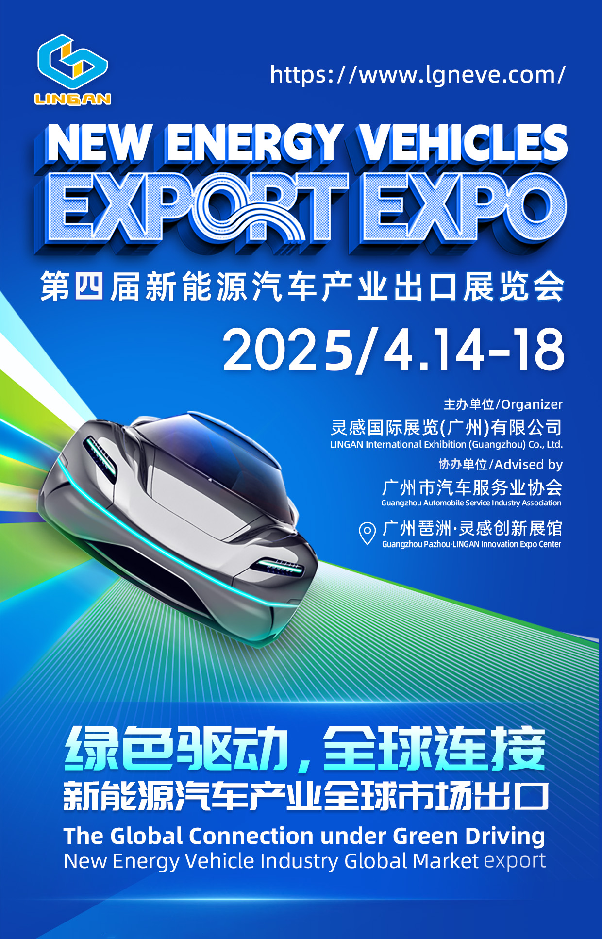 展会名称:2025第四届新能源汽车产业出口展 英文名称:2025 NEW ENERGY VEHICLES EXPORT EXPO 举办时间:2025年4月14-18日 地点:中国·广州琶洲·灵感创新展馆(即广交会展馆A区正对面) 主办单位:灵感国际展览(广州)有限公司