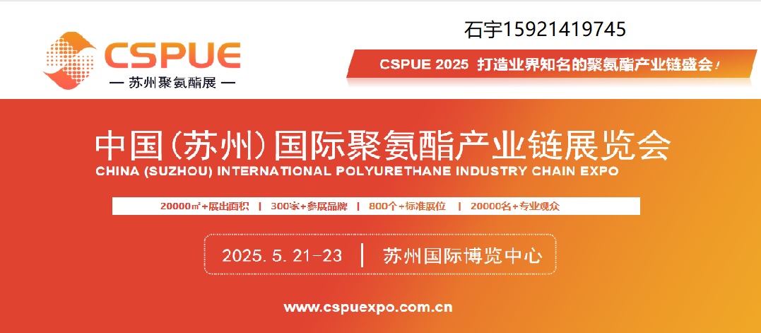 中国(苏州)国际聚氨酯产业链展览会 CHINA (SUZHOU) INTERNATIONAL POLYURETHANE INDUSTRY CHAIN EXPO 20000㎡+展出面积 丨 300家+参展品牌 丨 800个+标准展位 丨20000名+专业观众 2025.5.21-23 苏州国际博览中心