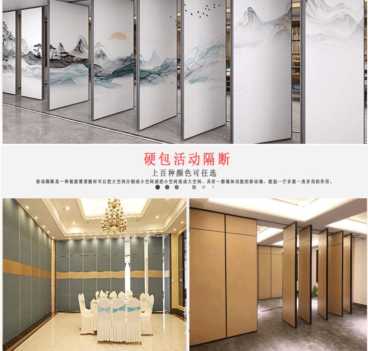 活动隔断具有高隔音、防火、可移动、操作简单等特点。极为适合星级酒店宴会厅、高档酒楼包间、高级写字楼会议室等场所进行空间间隔的使用。目前,活动隔断、固定隔断系列产品已经广泛适用在酒店、宾馆、多功能厅、会议室、宴会厅、写字楼、展厅、金融机构、政府办公楼、医院、工厂等多种场合。 活动隔断可以分为:拼装式活动隔断、推移式活动隔断、折叠式活动隔断、悬挂式活动隔断。活动隔断是一种根据需要随时把大空间分割成小空间或把小空间连成大空间、具有一般墙体功能的活动墙。活动隔断具有以下特点: 1.无地轨悬挂:地板无轨道,只需将轨道安装于天花板上; 2.稳定安全:隔断后稳固可靠,不易摆动; 3.隔音环保:隔音效果好,最大隔音系数可达53dB; 4.隔热节能:隔热性能优良,根据不同入座率,把大空间分割成小空间,以降低空调电耗; 5.高效防火:采用高效防火材料制作,防火性能良好; 6.美观大方:表面任意装饰,可与室内统一装饰效果; 7.收放灵活:隔板收放自如,推动灵活,一个人就可以完成隔断整个过程; 8.收藏方便:收板时,隔板可以隐藏在专用储柜中,不影响整体美观; 9.应用广泛:可应用于会议厅、展览厅、餐厅、高洁净工厂和办公室等场所