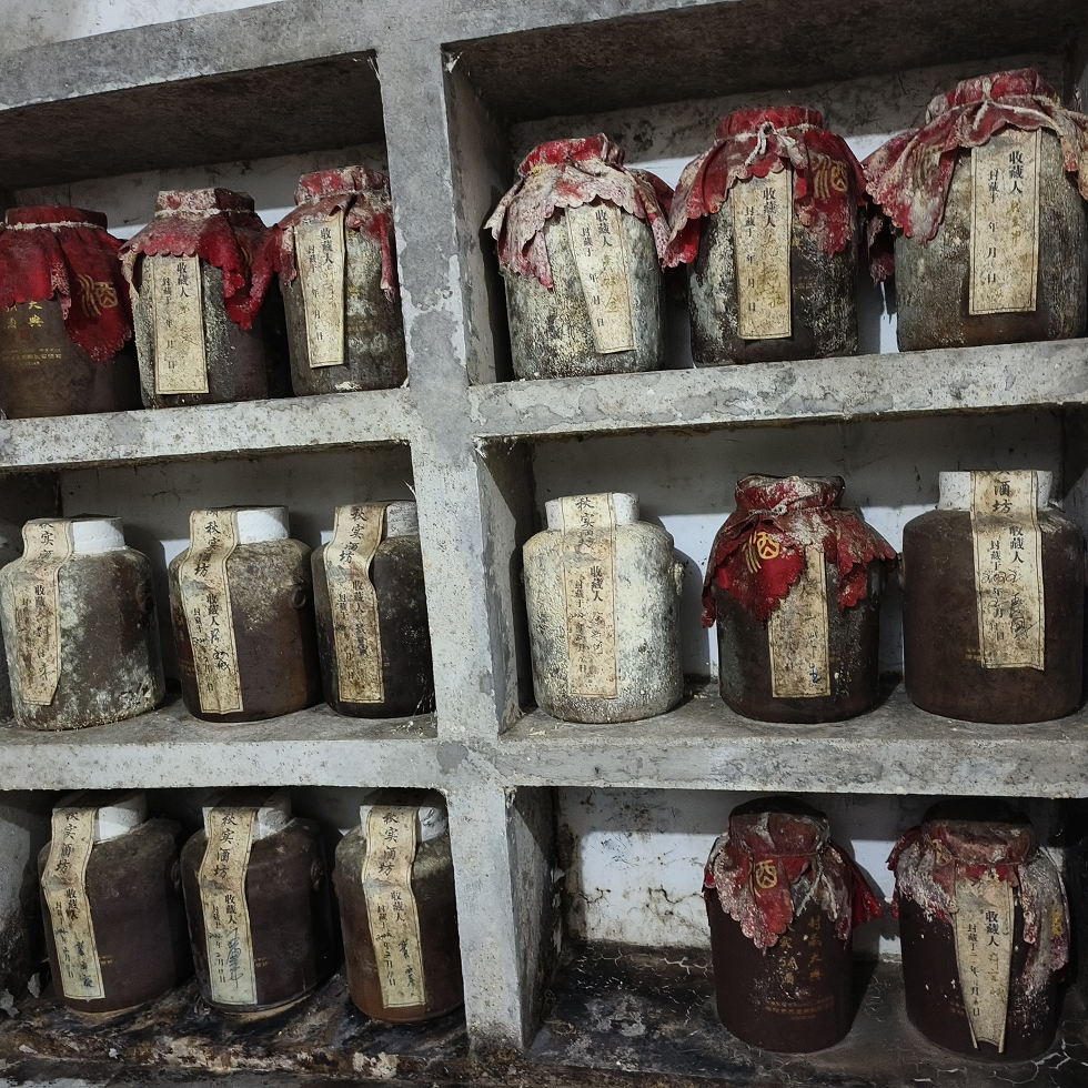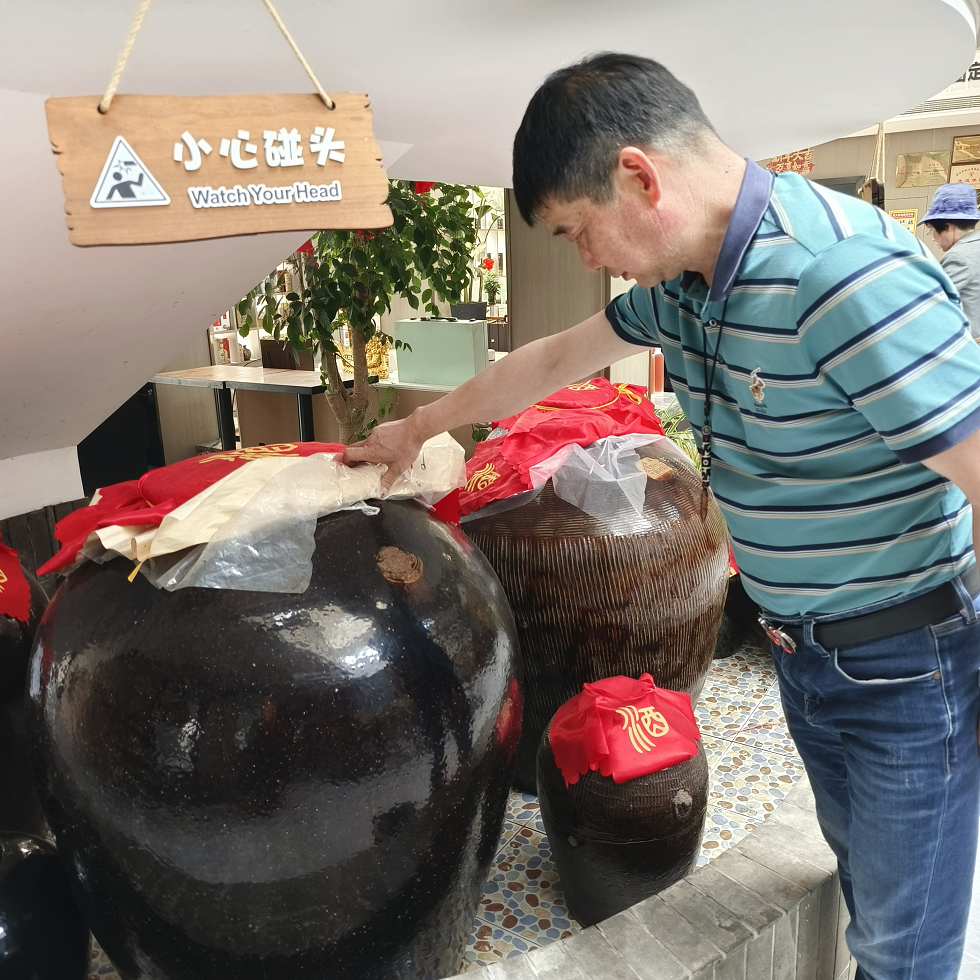 采访时,记者一行在周友智的引领下,参观了地窖发酵间。推进发酵车间门,冷气瘦瘦,浓浓的酒糟香扑鼻而来。周友智一边介绍说,空气凉,是因为恒温一直保持在25度左右,一边用手指着排列整齐的发酵大缸,介绍发酵的配比情况。他说,一般按100斤高粱,100斤小麦,5斤白茶,3斤白茶叶制作的红茶,加上天目湖的水,进行配比拌和发酵。当他掀开一个大缸的铺盖时,展现眼前的是金橙橙的酒糟,煞是好看。周友智用手捧起酒糟,并合力捏紧,只见醇香的白茶酒就溢了出来,变成一条线,让我们鼻翼一嗅,真的沁人心脾,很是陶醉。周友智还给我们介绍蒸馏取酒情况。然后,带我们坐小货电梯,到上面的储藏间。同样,储藏间排列着整齐的储酒大缸。储藏间的墙面,排列满满“私人定制”的白茶酒罐。酒罐个头明显比储酒大缸小,但也足有大几十斤。酒罐正面贴着封条,写着定制单位或定制个人姓名以及定制的时间。有的是前年的,有的是去年的,还有今年的。因为储藏间阴冷,这些“私人订制”的储藏酒罐斑斑驳驳。周友智开玩笑说,这样斑驳有历史感的酒罐只能在贵州溶洞酒窖里才能看得到。