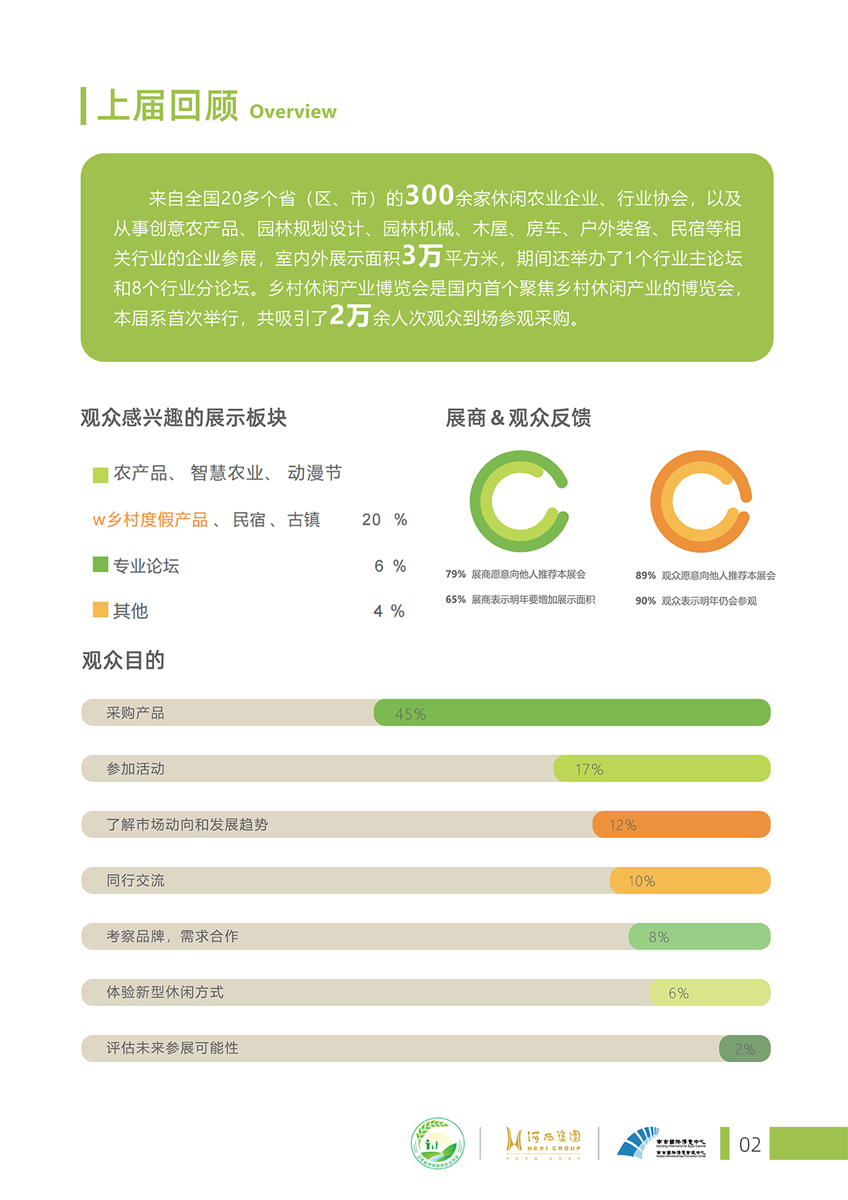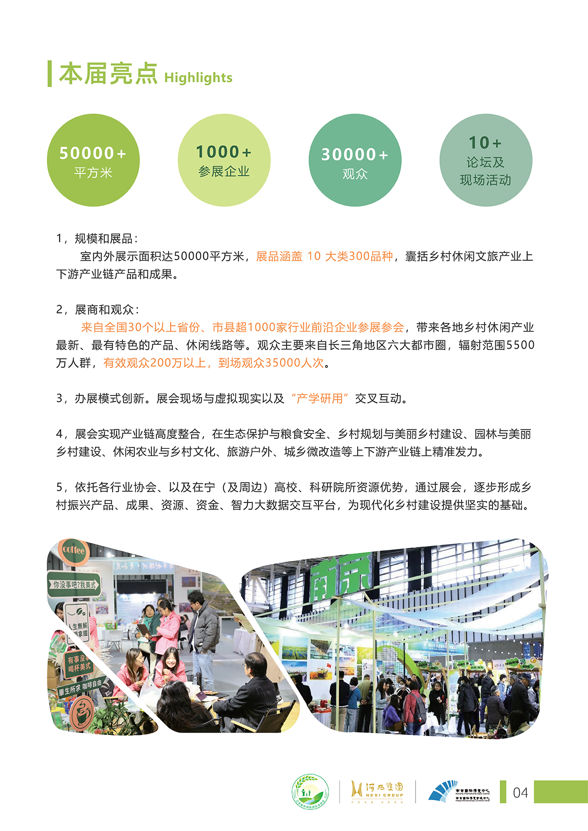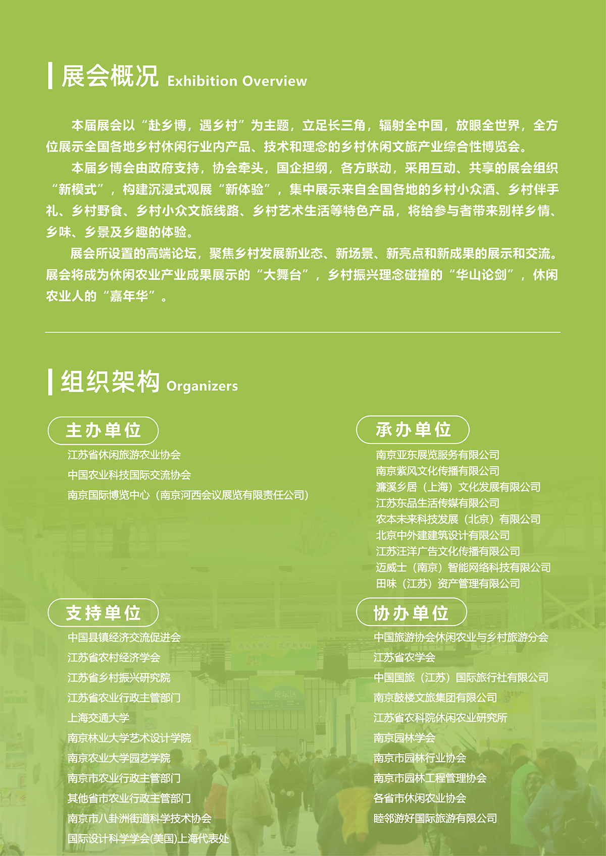 图文详情本届展会以“赴乡博,遇乡村”为主题,立足长三角,辐射全中国,放眼全世界,全方 位展示全国各地乡村休闲行业内产品、技术和理念的乡村休闲文旅产业综合性博览会。 本届乡博会由政府支持,协会牵头,国企担纲,各方联动,采用互动、共享的展会组织 “新模式”,构建沉浸式观展“新体验”,集中展示来自全国各地的乡村小众酒、乡村伴手 礼、乡村野食、乡村小众文旅线路、乡村艺术生活等特色产品,将给参与者带来别样乡情、 乡味、乡景及乡趣的体验。 展会所设置的高端论坛,聚焦乡村发展新业态、新场景、新亮点和新成果的展示和交流。 展会将成为休闲农业产业成果展示的“大舞台”,乡村振兴理念碰撞的“华山论剑”,休闲 农业人的“嘉年华”。